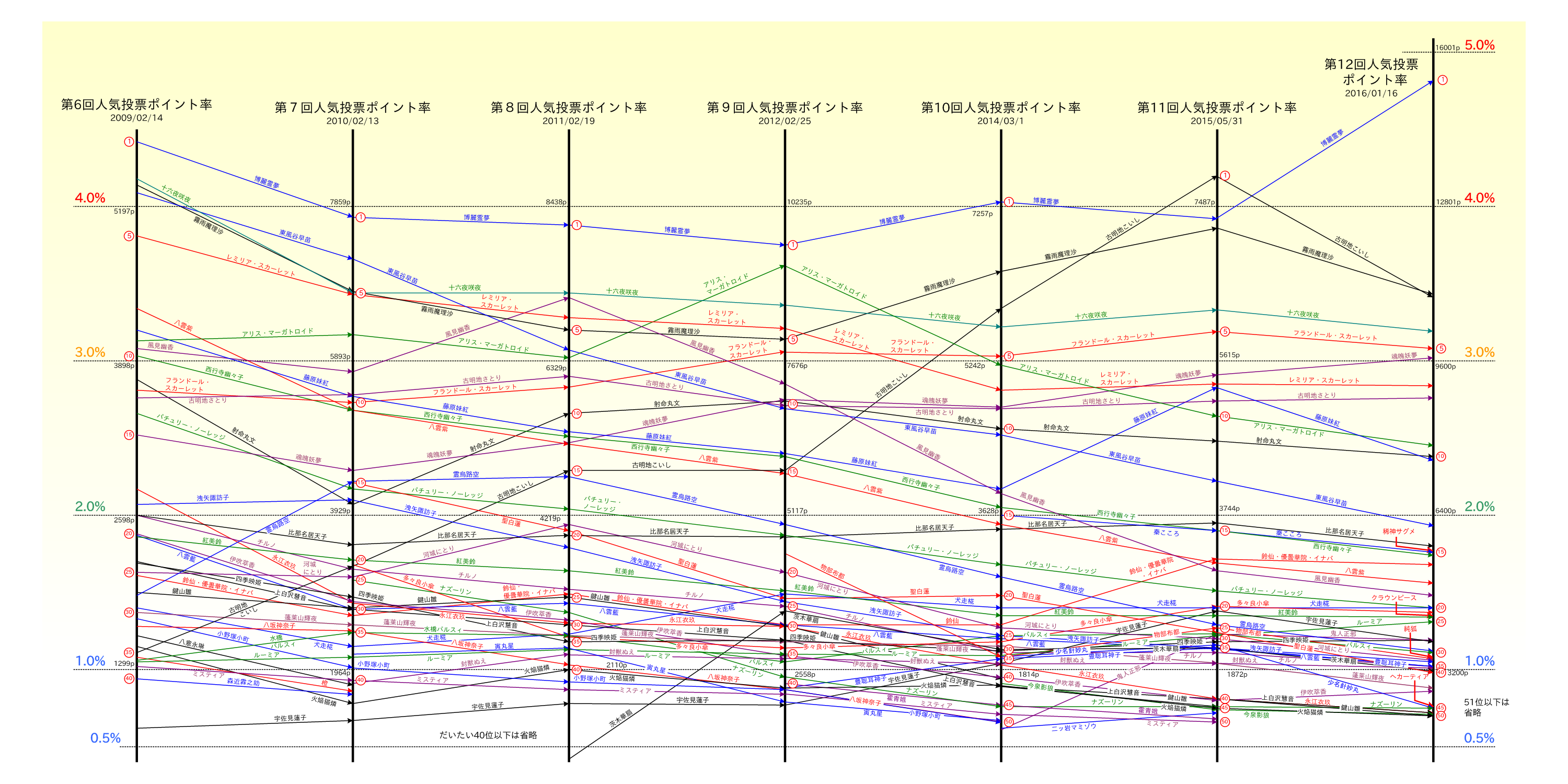 先週投票が行われた、第12回東方Projectの人気投票の結果から人妖部門について、いつものポイント率(全ポイントのうち該当キャラに投票されたポイント数の割合)についての推移をグラフを作成しました。(人妖部門以外はグラフは作ってません)